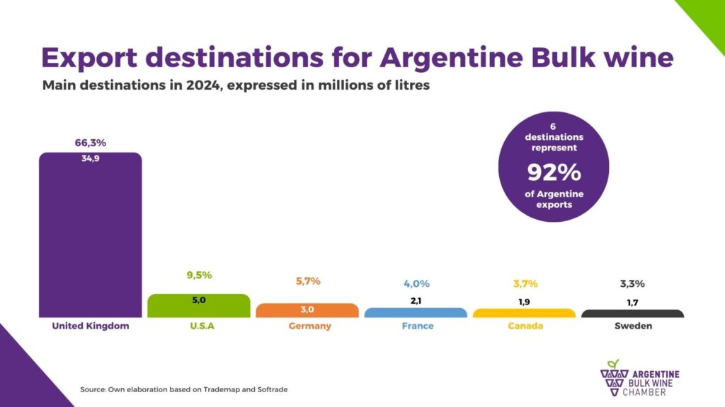 Argentina sells Bulk wine to 21 countries, but only six destinations represent 92% of our exports by volume: the United Kingdom (66.3%), the United States (9.5%), Germany (5.7%), France (4%), Canada (3.7%), and Sweden (3.3%).