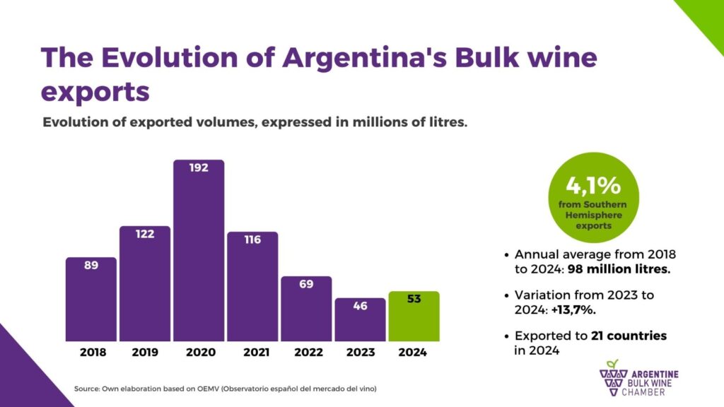 Argentina’s share of Bulk wine exports from the Southern Hemisphere is 4.1%. The average Bulk wine exports over the last five years was 98 million liters per year, reaching a peak in 2020 with 192 million liters and a low in 2023 with 45 million liters.