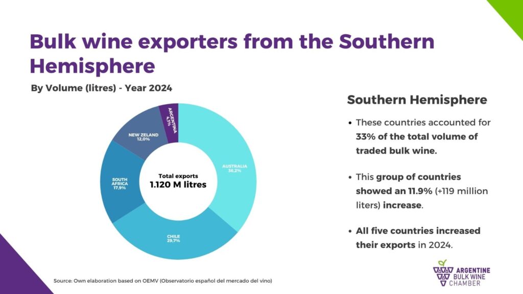 These countries represent 33% of global Bulk wine exports (1.12 billion liters in 2024), and supply the world’s main bottling and private label markets. Collectively, these countries increased their exports by approximately 12% last year.