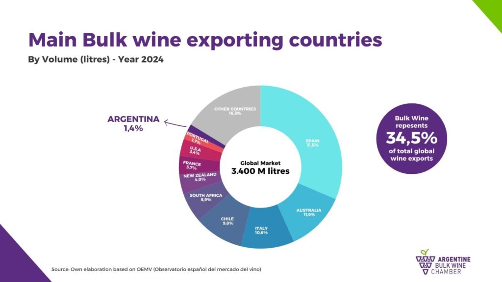 According to a report by the Argentine Bulk Wine Chamber, Bulk wine accounted for 34.5% of global wine exports in 2024, with a global market reaching 3.4 billion litres. Spain is the leading exporting country, with 31.5% of the total, followed by Australia (11.9%), Italy (10.6%), and Chile (9.8%). Far behind we come along South Africa, New Zealand, France, the United States, and Portugal, with Argentina in the 10th position, accounting for only 1.4% of global Bulk wine exports.
